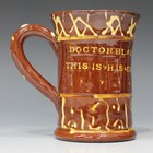 A Dicker Ware pottery mug, early 20th century, of tapering cylindrical form, inscribed in yellow slip 'Doctor Black Hailsham Sussex, This is his cut, 1st Sept 1911' within yellow slip decorated borders, impressed factory mark to base, height 13cm.