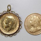 A Victoria Old Head sovereign 1899 and a George V sovereign 1911, within a 9ct gold pendant mount.