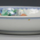 A Chinese famille verte porcelain saucer dish, mark of Kangxi but late 19th century, painted with a traveller standing beside his horse and attendant, greeted by two maidens beside a pavilion, underglaze blue four character mark to base, diameter 18.5cm (minor rim chips).