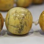 A Chinese single row necklace of thirty-five bone spherical beads, 20th century, each bead incised and stained with a seated Buddha opposing four characters, bead diameter approx 2.4cm.