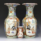 A pair of Japanese Imari porcelain vases, Meiji period, each shouldered body and flared neck painted with opposing figural and floral panels against a dense floral ground, iron red six character mark to bases, height 44.8cm (one repaired) and a similar smaller dragon moulded vase, height 15.5cm.