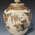 A Japanese Satsuma earthenware jar and cover, Meiji period, the ovoid body thickly enamelled and gilt with four circular panels representing the seasons, within simulated brocade borders of mon and ruyi heads on a gosu blue ground, the cover with similarly decorated borders, beneath a knop finial with gilt Tokugawa mon, gilt signature and blue enamelled Shimazu mon to base, height 18.5cm.