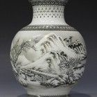 A Chinese porcelain vase, mark of Qianlong but Republic period, the globular body painted with a wintry coastal landscape with pavilions, boats, bridge, rocks, and mountains, beneath a short flared neck with black printed decoration, iron red printed four character seal mark to base, height 20.5cm.