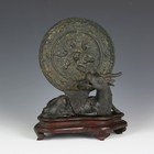 A Chinese bronze kylin mirror stand and mirror, Ming dynasty, the recumbent horned beast modelled with its head turned back toward a stylized cloud and crescent on its back, supporting an archaic circular mirror, one side cast with various animals and birds, length 19cm, with wood stand, total height 25cm. Note: bearing old collector's label to interior of kylin, inscribed 'Chinese mirror-stand Confucian unicorn early Ming W.R-S Col.', and red painted collector's mark/number 'C.M.28' to wood stand.