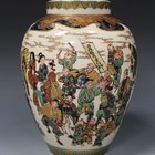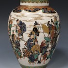 A Japanese Satsuma earthenware vase, Meiji period, the ovoid body thickly enamelled and gilt with a continuous festival scene of musicians, dancers, men, women and children, the shoulder enamelled with a blue, red, green and gilt shaped collar, gilt Shimazu mon, indistinct gosu blue enamelled signature and iron red seal to base, height 18.3cm.
