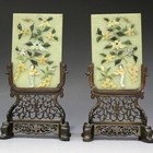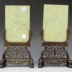 A pair of Chinese jade and hardstone rectangular table screens, early 20th century, each pale celadon jade panel applied with vari-coloured hardstone design of a maiden standing amongst rocks and flowers, each hardwood stand carved and pierced with leaves and tendrils, total height 25.5cm.