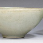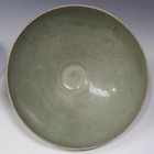 A group of three Korean celadon circular bowls, Koryo/Choson dynasty, the first incised with two birds to interior, diameter 18.4cm, the second carved in low relief with a floral interior, diameter 19.7cm, the last of steep sided form with floral carved interior, diameter 15.8cm (all with faults and two repaired).
