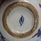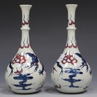 A pair of Chinese underglaze blue and red decorated porcelain bottle vases, Kangxi style but modern, each decorated with a dragon, height 15.4cm.