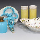 A pair of Royal Worcester porcelain wall brackets, late 19th century, each with a blue ribbon tied as a bow apron, impressed factory mark to backs, height 17cm (restored), together with a group of other decorative ceramics, including a Continental porcelain rectangular tea caddy, painted with puce floral sprays, and a blue opaline glass perfume bottle with enamel and gilt metal mount.