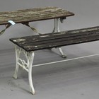 A 20th century white painted cast metal and wooden slatted garden table, height 48cm, length 110cm, together with a similar table, height 40cm, length 122cm.