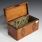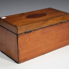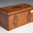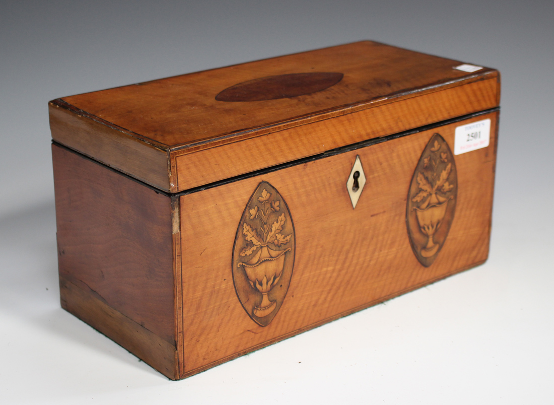 A George III satinwood tea caddy, the hinged lid enclosing a later silk-lined interior, the front inlaid with a pair of flower-charged urn oval reserves, width 31cm (faults).