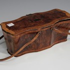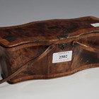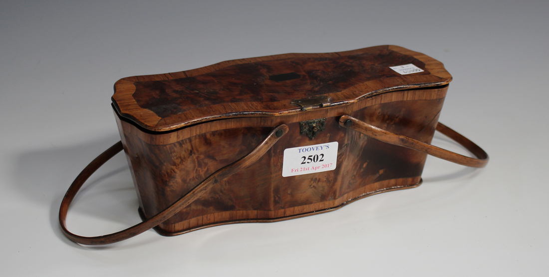 A late 18th century thuya and kingwood crossbanded needlework box of shaped outline, fitted with a pair of swing handles, length 23cm.