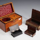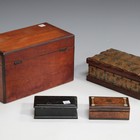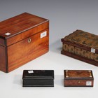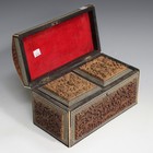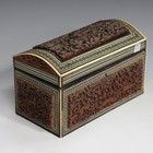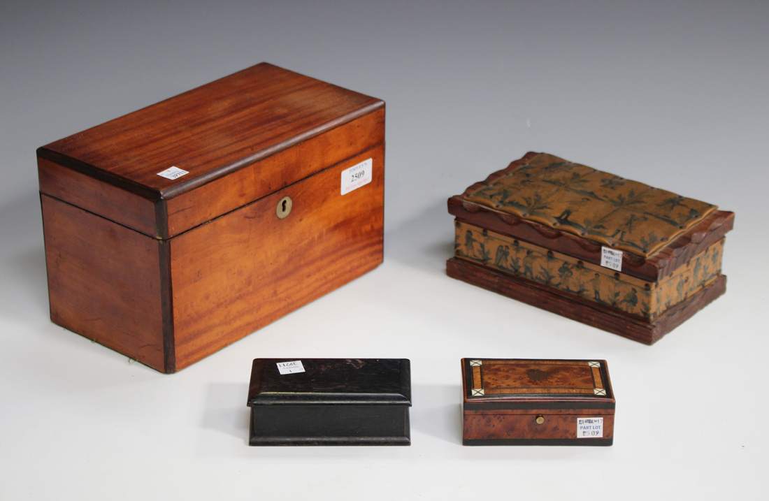 A Victorian mahogany tea caddy, width 25.5cm, a 19th century Indian carved sandalwood and sadeli work tea caddy, width 26cm, together with three other boxes.