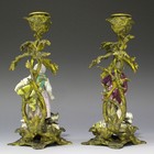 A pair of ormolu mounted Meissen figural candlesticks, late 19th century, each modelled as a girl feeding chickens and a boy feeding ducks, on a gilt scroll moulded base, fitted on cast ormolu naturalistic candlestick stands, crossed swords in underglaze blue and incised '2814' to bases, height 22cm (minor faults).