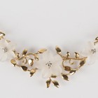 A gold diamond set and frosted crystal necklace, designed as three flowerheads, each centred with a claw set circular cut diamond, on an oval link neckchain with a boltring clasp, length 39.5cm.