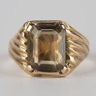 A gold ring, claw set with a cut cornered rectangular step cut smoky quartz between ridged shoulders, ring size approx N.
