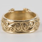 A 9ct gold ring, cast as a strap with two buckles between scrolling decoration, ring size approx Y.