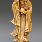 A Chinese soapstone carving of Shoulao, late Qing dynasty, modelled standing holding a dragon staff and peach, on an integral pierced rocky base, height 25cm.