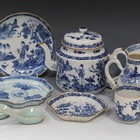 A collection of Chinese blue and white export soft paste porcelain tea and coffee ware, Qianlong period, including teapot and cover, cream jug, slop bowl, sugar bowl, four coffee cups, three teabowls and saucers, hexagonal spoon tray, saucer dish, all painted with a figure standing at the water's edge, together with another blue and white export porcelain octagonal spoon tray and two celadon glazed spoons (faults).