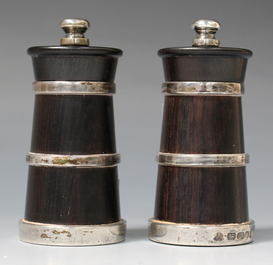 A pair of silver mounted turned hardwood pepper mills, each of tapering cylindrical form with banded decoration, London 2003 by M.C. Hersey & Son Ltd, height 9.4cm.