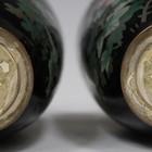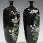 A pair of Japanese cloisonné vases, Meiji/Taisho period, each shouldered tapering body decorated with a bird flying above chrysanthemum and other flowers on a midnight blue ground, height 18.5cm, with wood stands and pine box.
