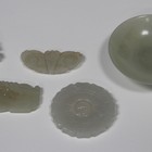 A small group of Chinese celadon jade carvings, 19th century and later, comprising a cat and kitten, length 4.8cm, a butterfly pendant, a chilong pendant, a disc (bi) of flowerhead form, the articulated centre carved in low relief with taijitu symbol, diameter 6cm, and a circular shallow bowl.