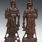 A pair of Chinese carved hardwood figures of maidens, early 20th century, each modelled standing with wire inlaid decoration, height 38cm (minor chips).