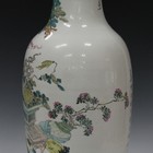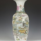 A Chinese famille rose porcelain vase, Guangxu period, by Xu Pinheng, the tapered body and flared neck painted to one side with a group of precious vessels, flowers, tables, screen, Buddhistic lion and fruit, the reverse with lines of black text and red seal, red printed seal mark to base, height 61cm (minor restoration to neck).