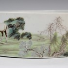 A Chinese porcelain bowl, four character mark of Qianlong but 20th century, of cylindrical form, the exterior enamelled with a continuous riverside scene of the eight horses of Muwang amidst rocks and trees, opposing ten black painted characters and three red seals, blue enamelled four character mark to base, diameter 23cm.