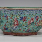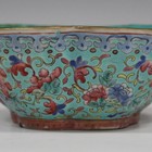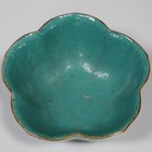 A Chinese famille rose enamelled turquoise ground porcelain bowl, mark of Tongzhi and possibly of the period, of lobed cinquefoil form, the exterior filled with flowers and scrolling tendrils, iron red enamelled seal mark to base, width 14.2cm (restoration to rim).