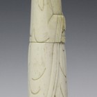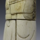 A Chinese carved sectional bone figure of a sage, possibly Confucius, Ming dynasty, modelled standing full-length, wearing a long robe and holding a fan, height 22cm, with wood stand.