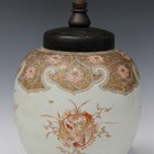 A Chinese porcelain ginger jar, 18th century, the ovoid body painted in iron red and gilt with four crane roundels beneath a green edged ruyi head collar, filled with iron red, grey and gilt scrolling lotus flowers and tendrils, height 19.5cm, with a carved and pierced hardwood stand and wood cover (converted to a table lamp, drilled for electricity and star crack to body).