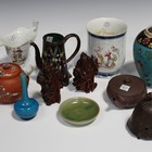 A Chinese celadon glazed circular dish, diameter 8.5cm, a Chinese turquoise glazed pottery bottle vase, 19th century, height 10.3cm, and a small collection of Oriental porcelain, pottery and works of art (some faults).