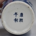 A Chinese blue and white porcelain vase, mark of Kangxi but late 19th century, the shouldered tapering body painted with opposing phoenix amidst peony, underglaze blue pseudo four character mark to base, height 20.5cm.