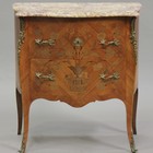 A late 20th century French kingwood and gilt metal mounted bombé commode, the moulded marble top above two drawers inlaid with flowers, on cabriole legs, height 84cm, width 79cm, depth 43cm.