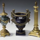 A modern blue glazed ceramic and gilt metal mounted decorative urn, height 35cm, together with two modern table lamps.