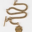 A 9ct gold graduated curblink watch Albert chain, fitted with a 9ct gold T-bar, a 9ct gold swivel and a 9ct gold mounted George V sovereign 1911, length 34.5cm.