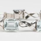 An aquamarine bracelet, claw set with a row of seven cut cornered rectangular step cut aquamarines, alternating with twist-over loop shaped links, on a snap clasp, length 18.5cm, total aquamarine weight approx 30.00-33.00ct.