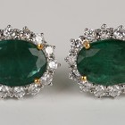 A pair of 18ct white gold, emerald and diamond cluster earrings, each claw set with an oval cut emerald within a surround of circular cut diamonds, with post and butterfly fittings, detailed '750', length 1.5cm, total emerald weight approx 6.65ct, total diamond weight approx 1.20ct.