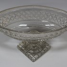 A cut glass oval dish, late 19th century, with slice and diamond cut decoration, on a knop and faceted stem and stepped foot, raised on a square base, height 16.2cm.