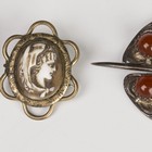 A gold and enamelled bar brooch with a shield motif, detailed '9ct', a Scottish silver and cornelian plaid brooch in a Celtic design, Edinburgh 1966, two further brooches, a gilt metal neckchain, part of an enamelled buckle and a cameo finial.