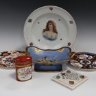 A Carlton Ware two handled rectangular footed dish decorated with Feathertailed Bird and Flower pattern against a matt glazed mottled blue ground, blue printed factory marks and pattern No. '3354' to base, length 30.5cm, a set of eight Coalport bone china circular plaques, each decorated with a Pratt ware pot lid design, including 'Haddon Hall', 'Chatsworth' and 'Hafod. S.W', together with a group of other decorative ceramics.