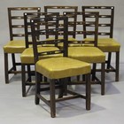 A set of six late George III mahogany pierced ladder back dining chairs, the seats overstuffed, raised on block legs.