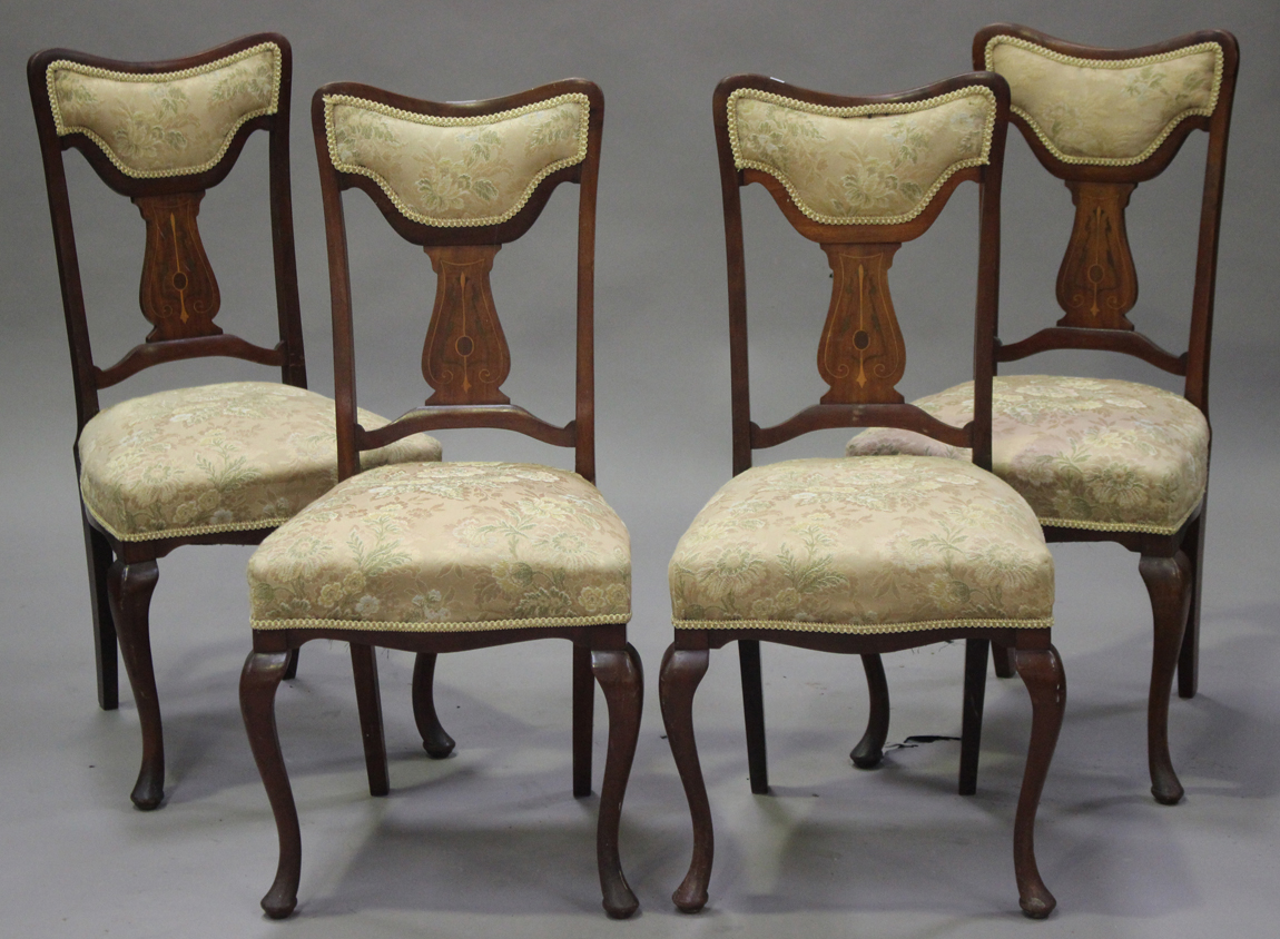 A set of four Edwardian mahogany salon chairs with inlaid splat backs and padded seats, raised on cabriole legs and pad feet, height 93cm, width 48cm.