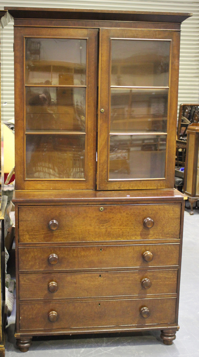 A Victorian mahogany secrétaire bookcase chest, the moulded pediment above two glazed doors, the base with secrétaire drawer above three long drawers, on turned bun feet, height 210cm, width 105cm (faults).