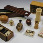A small collection of Victorian games, including a cased 'Bell & Hammer' game, two cased sets of dominoes, a 19th century carved ivory dice shaker, height 10.5cm, a 19th century turned horn flask and a small group of other items.