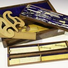 A late Victorian walnut cased drawing instrument set, the interior with two fitted detachable trays containing instruments, ivory and boxwood rules, length 36cm.