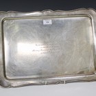 A George V silver rectangular two handled tea tray, engraved with an inscription 'Alderman Albert Johnson on his admission as an Honorary Freeman of the City of Portsmouth on the 24th June 1966' beneath a crest inscribed 'Heaven's Light our Guide', Sheffield 1932 by Atkin Brothers, length 54.5cm.