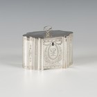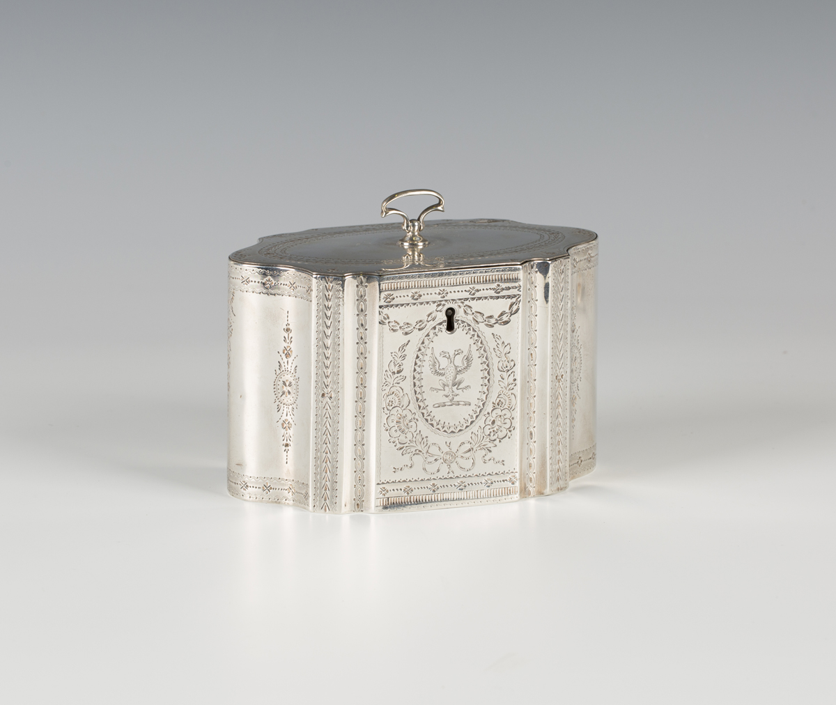 A George III silver tea caddy of shaped oval serpentine outline, the hinged lid with loop handle, the front engraved with an oval cartouche with a twin headed eagle crest, framed by a floral garland and foliate engraved vertical bands, London 1782 by Alfred Ivory, height 12cm.