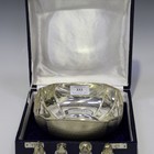 A white metal bowl with matt and engraved decoration, width 6.3cm, together with four silver topped cut glass peppers, each silver top modelled as a cockerel, chick, spaniel or frog head.